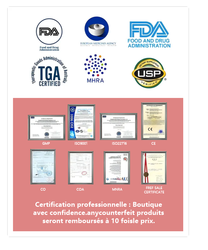 Nos produits sont conformes aux normes internationales les plus strictes (FDA, ISO, GMP, CE…).