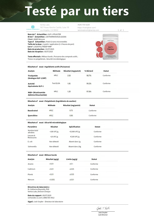 Nos patchs GLP-1 ont été testés par Veritas Labs pour garantir une sécurité et une efficacité optimales.