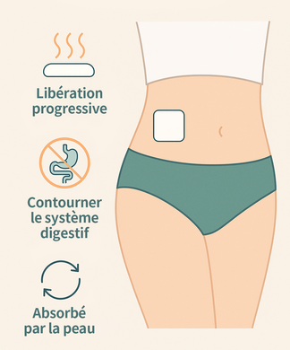 Nos patchs offrent un avantage certain par rapport aux comprimés : ils libèrent les ingrédients directement dans la circulation sanguine, contournant ainsi le système digestif, pour des résultats plus rapides et plus efficaces.